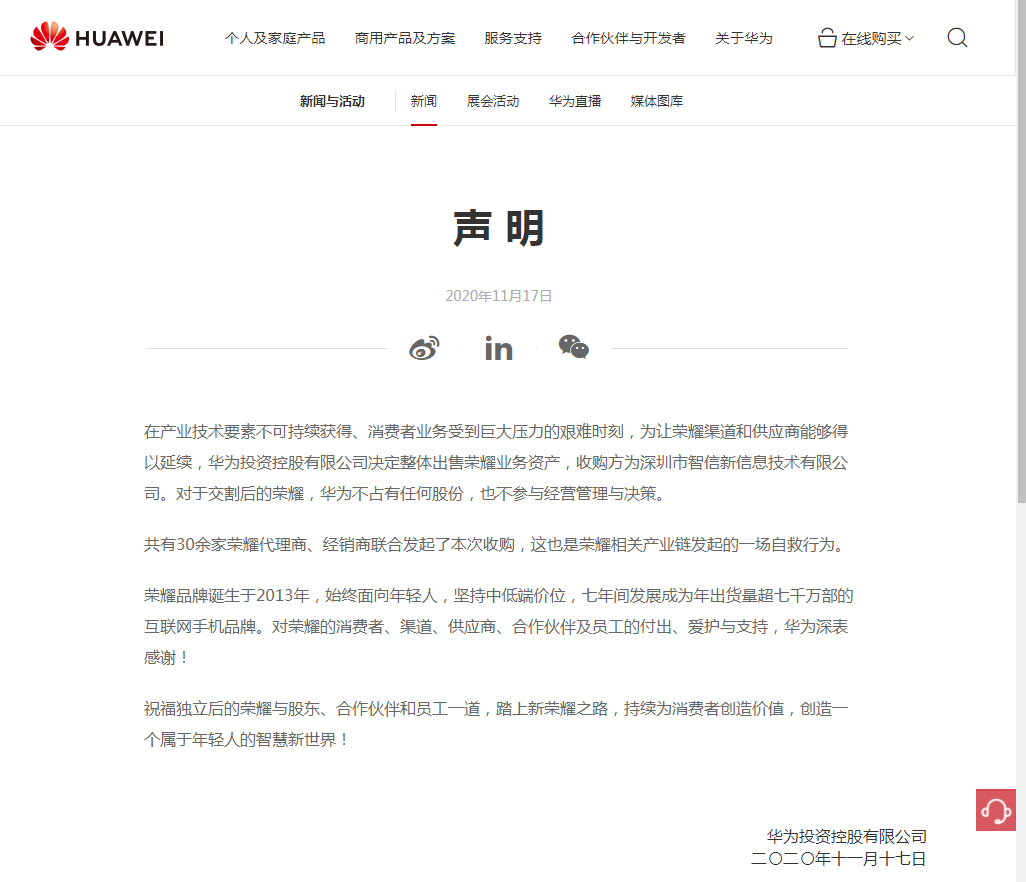 Huawei on Tuesday announced that it has sold Honor, its sub-brand for budget smartphones, to a consortium of buyers that include agents, dealers, and government-backed entities, in a “rescue move” to preserve it from US sanctions.